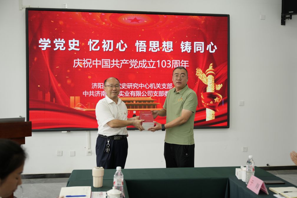 濟(jì)陽區(qū)委黨史研究中心主任王四彥代表濟(jì)陽區(qū)委黨史研究中心機(jī)關(guān)支部向中共濟(jì)南長田實(shí)業(yè)有限公司支部委員會(huì)贈(zèng)送珍貴的黨史資料《中共濟(jì)南市濟(jì)陽區(qū)歷史簡明讀本》,為了解濟(jì)陽地方歷史文化、學(xué)習(xí)地方黨史等提供了可靠、可信的資料;為黨史文化和革命精神在企業(yè)普及傳承提供重要的精神食糧,希望這些書籍能夠發(fā)揮應(yīng)有作用,讓廣大干部群眾特別是年輕黨員干部接受紅色文化熏陶,讓紅色基因代代相傳。